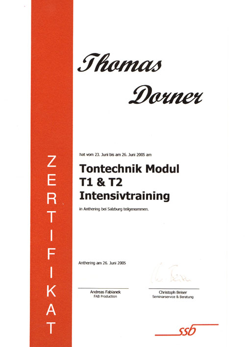 Thomas ist gelernter Veranstaltungstechniker und kann Zertifikate in Live Sound Tuning, Tontechnik und Life-Mix-Technik vorweisen.